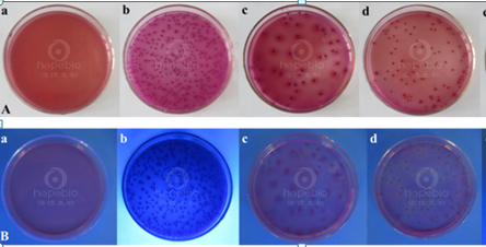 用于食品中大肠杆菌的平板计数,其中蛋白胨和酵母膏粉提供碳氮源和微量元素;乳糖是可发酵的糖类;氯化钠可维持均衡的渗透压;胆盐和结晶紫抑制革兰氏阳性菌,特别抑制革兰氏阳性杆菌和粪链球菌;中性红为pH指示剂;琼脂为凝固剂;大肠埃希氏杆菌含有的葡萄糖醛酸苷酶作用于4-甲基伞形酮-β-D葡萄糖醛酸苷的β糖醛酸苷键,使其水解,释放的4-甲基伞形酮在366nm紫外灯下产生蓝白色荧光。97%的大肠埃希氏杆菌、10%的沙门氏菌以及少量的志贺氏菌具有葡萄糖醛酸苷酶。