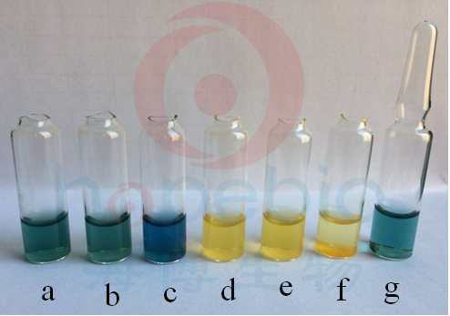 备注:a:单增李斯特氏菌,b:英诺克李斯特氏菌,c:福氏志贺氏菌,d:伊氏李斯特氏菌,e:西尔李斯特氏菌,f:肺炎克雷伯氏菌,g:空白生化管