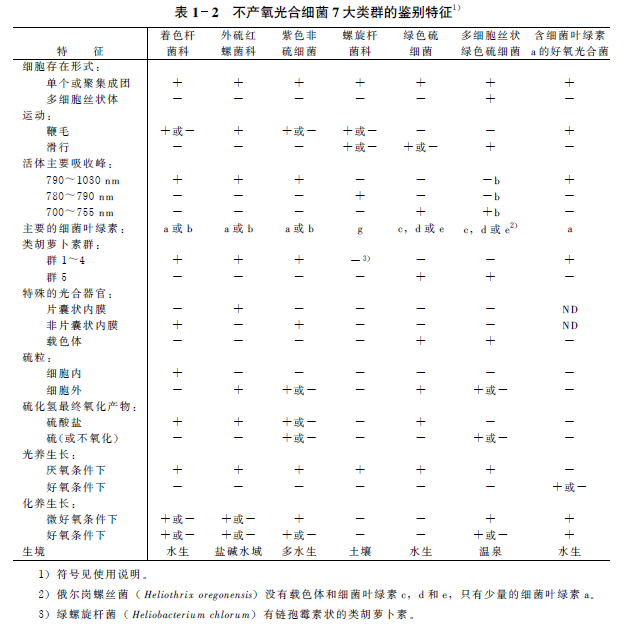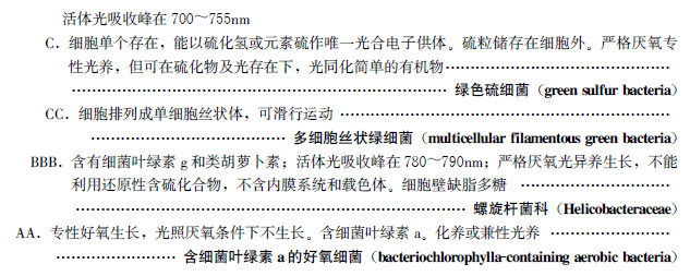 目前,所知的光合细菌可分为着色杆菌科、外硫红螺菌科、紫色非硫细菌、绿色硫细菌、多细胞丝状绿细菌、螺旋杆菌科、含细菌叶绿素的专性好氧菌等7大类群,现将各大类群的主要特征描述如下。