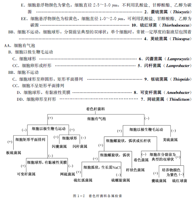 细胞球形、卵形、杆状、弧形或螺旋形;二分分裂方式繁殖。运动或不运动;有或没有气泡运动类型的细胞,具有极生鞭毛,单根或丛生。光合内膜系统与细胞质膜相连,呈囊泡状,只有一个种 Thiocapsa p fennigii 含有管状内膜和细菌叶绿素b。所有其他种均含有细菌叶绿素a和类胡萝卜素的第1、3、4群。通常含有类胡萝卜素群1菌株的培养物呈现橘棕色到红棕色或粉色,含类胡萝卜素群3的呈现紫红色,含胡萝卜素群4的菌种呈现紫罗兰色。