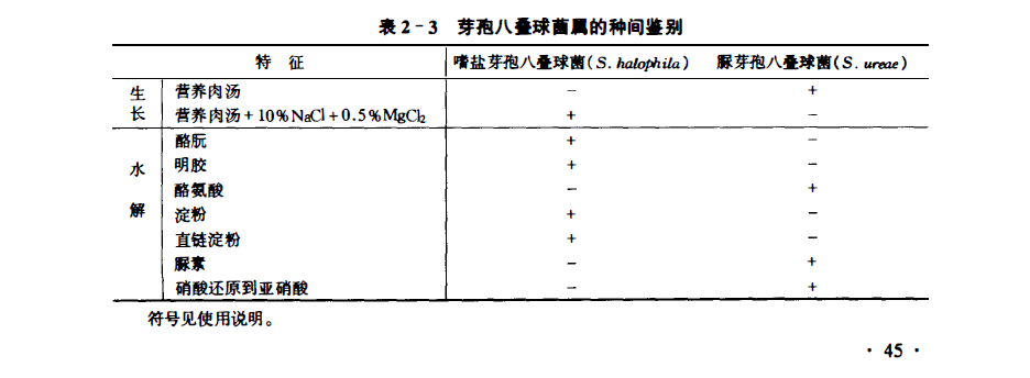模式种:脲芽袍八叠球菌(Sporosarcinaureae)。种间鉴别见表2-3。