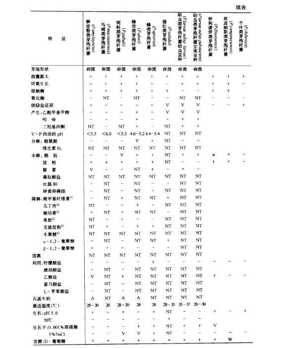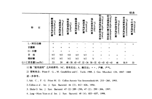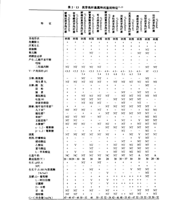 自1993年Ash Priest Collin等提出从芽抱杆菌中分出11个种,另立类芽抱杆菌属之后,至今已有23个种,它们间的鉴别可见表2-13。进一步参考: I. J. S. B. 44: 852,1994; 47 (2): 289~298, 299~306, 1997。