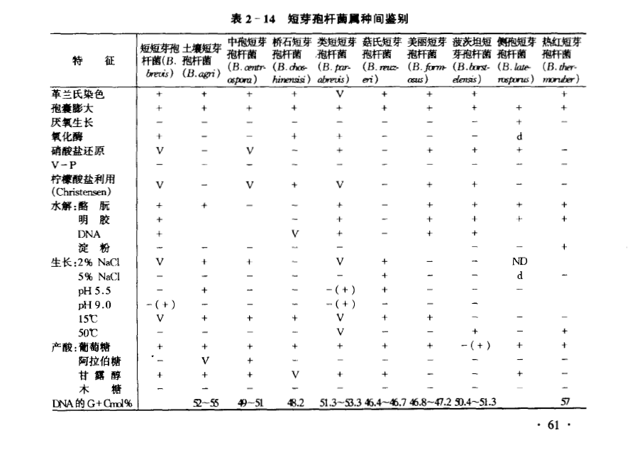 本属包括10个种:短短芽孢杆菌(Br brevis)、土壤短芽孢杆菌(Br. agri)、中孢短芽孢杆菌(Br. centrosporus)、桥石短芽孢杆菌(Br. choshinensisi)、类短短芽孢杆菌(Br. parabre初s)、菇氏短芽孢杆菌(Br. reus如-i)、美丽短芽孢杆菌 (Br. formosus)、疲茨坦短芽孢杆菌(Br. borstelensis)、侧孢短芽孢杆菌(Br. lat erosporus)、热红短芽孢杆菌(Br thermoruber)。它们的鉴别见表 2-14。进一步参考: I. J S. B. 46 (4): 939~946, 1996。