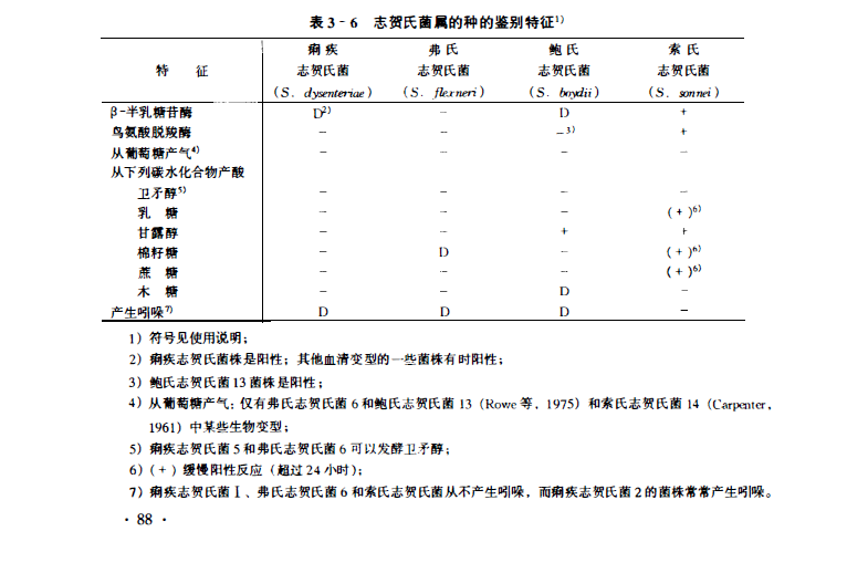 KCN中不生长,不产H2S。是入和灵长类的肠道致病菌,引起细菌性痢疾。DNA的G +C mol%为49-53(Tm)。种间鉴别见表3-6。