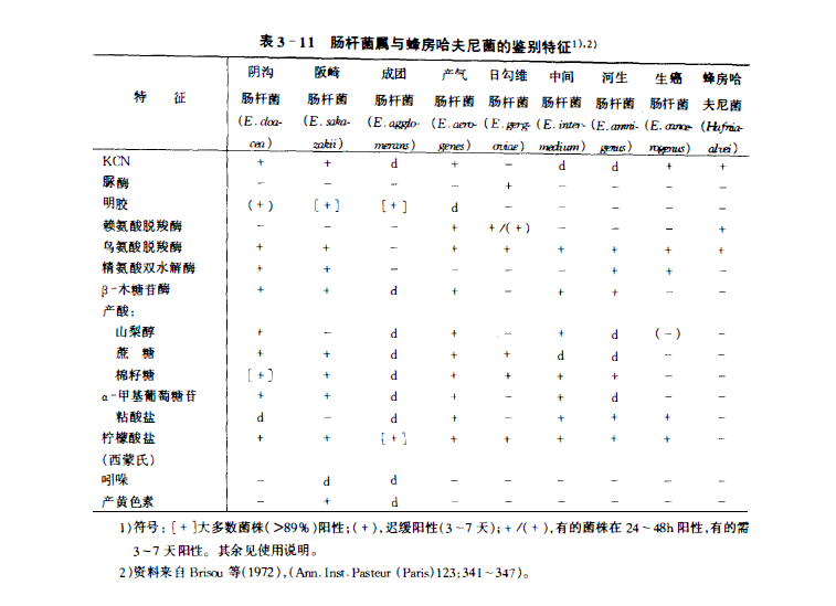 直杆状,宽0.6-1.0μmX1.2-3.0μm, 符合肠杆菌科的一般定义。革兰氏阴性,周生鞭毛(通常4-6根)运动。兼性厌氧,容易在普通培养基上生长。发酵葡萄糖,产酸产气(通常仅易:H2 = 2: 1)。在44.5°C时不能由葡萄糖产气。大多数菌株VP试验 阳性,MR试验阴性。一般可利用拧檬酸盐和丙二酸盐作为惟一的碳源和能源。不从硫代硫酸盐产生H2S。多数菌株可将明胶缓慢液化,不产生脱氧核糖核酸酶。最适生长温度为30°C,多数临床菌株在37°C生长,有些环境菌株37°C时生化反应不稳定。广泛分布于自然界,普遍存在于人和动物中。DNA的G+Cmol%为52-60(Bd)。种间和相近属的鉴别见表3-11。