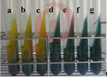 备注:a:大肠埃希氏菌,b:伤寒沙门氏菌,c:普鼠伤寒沙门氏菌,d:福氏志贺氏菌,e:宋内志贺氏菌,f:痢疾志贺氏菌,g:空白对照