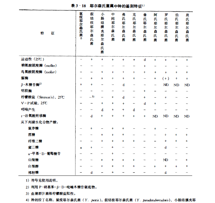 直杆菌到球杆菌,直径0.5~0.8μm,长1~3μm。无芽孢。不形成荚膜,但在 37°C生长或来自体内样品的细胞中的鼠疫耶尔森氏菌(Y.pestis)能产生包被。革兰氏阴性。37°C时不运动。生长在30°C以下时以周生鞭毛运动。鼠疫耶尔森氏菌总是不运动。在普通的营养培养基上生长。在营养琼脂上培养24h后,菌落半透明到不透明,直径0.1~1.0mm。最适生长温度28~29°C。兼性厌氧,既具有呼吸型代谢又具有发酵型代谢。氧化酶阴性,接触酶阳性。除了个别的生物变型(biovars)外,都能还原硝酸盐成亚硝酸盐。发酵葡萄糖和其他碳水化合物产酸,但不产气或产少量的气。表现特征常常与温度有关,一般培养在25~29°C比在37~39°C能呈现出更多的特征性。所研究过的种具有肠杆菌的常见抗原。生境很广泛(从有生命到无生命),有些种适应于特异性寄主。DNA的G+Cmol%为46-50(Tm, Bd)。种间鉴别见表3-18。