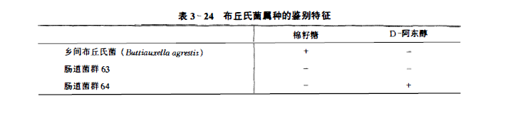 1981年Ferragut等提议是肠杆菌科的一个属。表型特征近似克吕沃尔氏菌属,不同点前者不发酵乳糖而后者发酵乳糖,而且GC含量分别为49和55~56 mol%,最重要的是DNA相关性仅30%~36%, 因此可成立新属,命名为布丘氏菌属(Buttiauxel-la)。分自淡水。表型特征十分相似的肠道菌群63和64,它们的鉴别见表3-24。