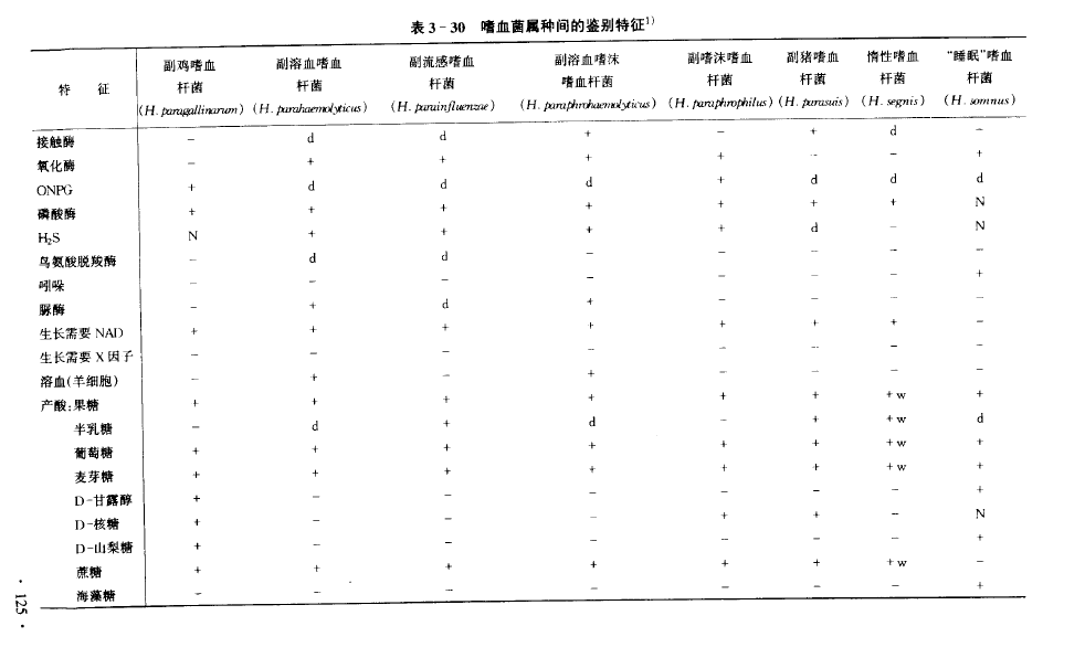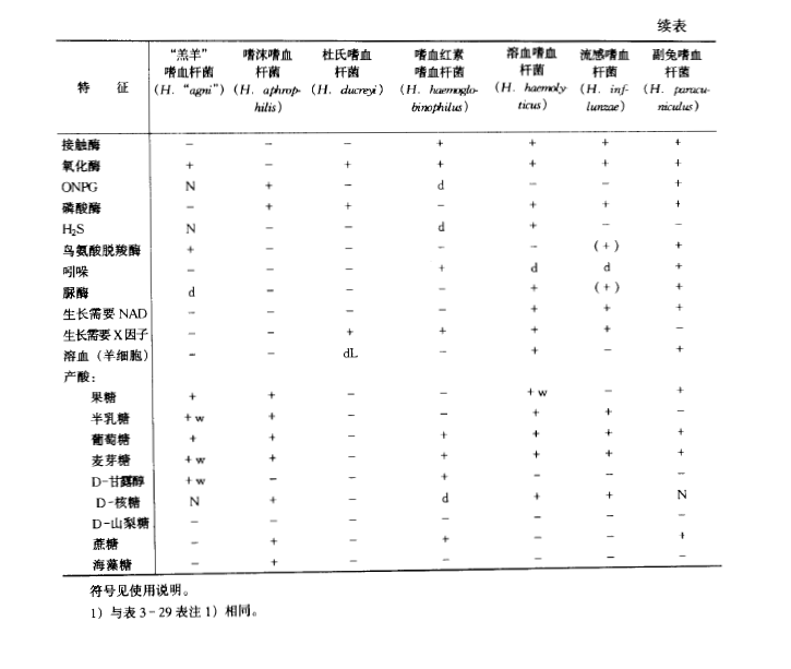 在《伯杰氏系统细菌学手册》中嗜血杆菌属中许多种已发生变化:埃及嗜血杆菌与流感嗜血杆诸是同一个种(Casin等AnnMicrobial.137B:155 -163, 1986)。 我们认为它是流感血杆菌的一个生物变种;种的鉴别特征见表3-30。