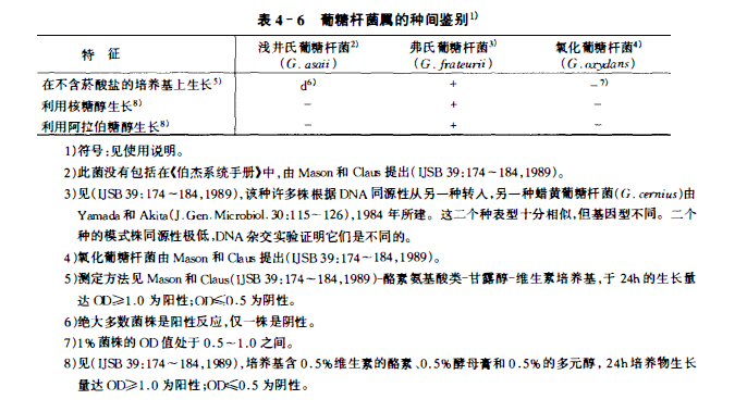 细胞椭圆到杆状,0.5-1.0μmX2.6-4.2μm单个或成对,罕见成链。大的不规则细胞状(退化体)可能出现。不生孢。革兰氏阴性(少数可变)。运动或不运动,如果运动细胞具3~8根极生鞭毛,罕见单根鞭毛。严格好氧,以氧作为末端电子受体的严格呼吸代谢,尽管最近报道有的菌株能还原硫代硫酸盐到H2S。能在含硫代硫酸盐的山梨醇培养基中产生H2S(纸条法)。菌落苍白色。最适生长温度25-30°C,37°C不生长。最适pH5.5-6.0,多数菌株在pH3.6生长。接触酶强阳性,氧化酶阴性。不还原硝酸盐,不液化明胶,不产吲哚。优能异养菌。氧化乙醇到乙酸。不氧化乙酸盐或乳酸盐到CO2和H2O。能从多醇类生酮,反应强阳性。从D-葡萄糖和D-木糖产酸。所有菌株从D-葡萄糖产2-酮基葡萄糖酸,大多数菌株可形成5-酮基葡萄糖酸。不水解淀粉。葡糖杆菌可出现在花、园土、啤酒酵母、果实、蜜蜂、葡萄酒、苹果酒、啤酒、南非班图酒、酒醋、软饮料。有的菌株可能引起疲萝病害和苹果及梨的腐烂,但这些菌株的鉴定是可疑的。葡糖杆菌出现在富糖环境,不同于醋杆菌,后者多在富醇的环境。相近属的鉴别见表4-4,属内种间的鉴别见表4-6。