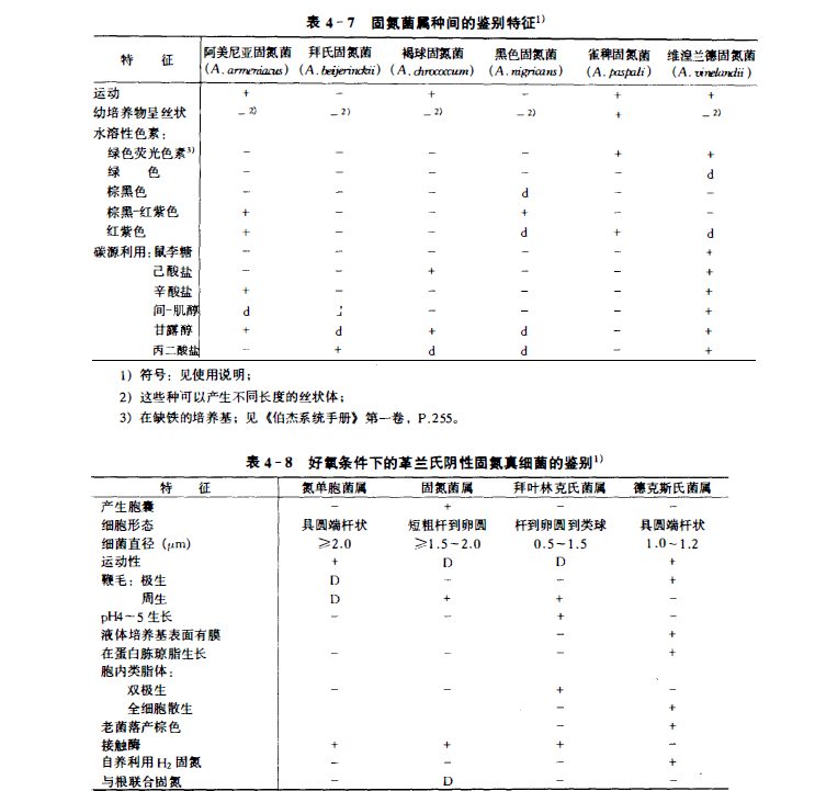 大的椭圆细胞,直径为1.5~2.0μm,从杆状到类球状的多形态。单个、成对或不规则的堆状,有时有长度不等的链状。不形成芽孢,但有胞囊。革兰氏染色阴性。以周生鞭毛运动或不运动。好氧但能在低氧压下生长。所有种的一些菌株产生水溶性和非水溶性色素。化能异养菌。能利用糖、醇和有机酸及其盐类。固氮;每消耗lg碳水化合物(通常葡萄糖)至少可非共生固氮10mg。钼为固氮作用的必需因子,但可被钒部分代替,不解朊。可利用硝酸盐和氨盐(一个种除外)和一些氨基酸作为氮源,接触酶阳性。在有结合氮时,最适pH4.8~8.5;生长和固氮的最适pH7.0~7.5.出现在土壤和水;一个种与植物根有关。该属有6个种,它们的鉴定表特征列于表4-7,在好氧条件下可固氮的属包括固氮菌属、拜叶林克氏菌属、氮单胞菌属和德克斯菌属,它们的鉴别特征列于表4-8.