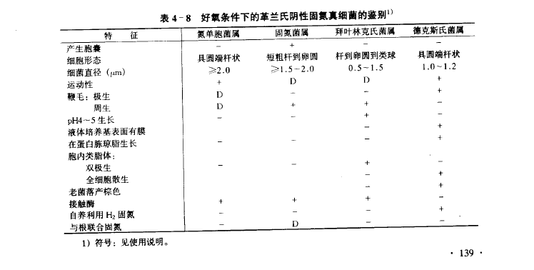 具圆端的杆菌,1.0~2.0μm X 3.0~6.0μm,单个或短链。细胞由于菌龄和培养基不同而出现多形态。老龄细胞常有连在一起的长丝状体,有时有局部膨大或扭曲的细胞。有的细胞很大(可达30μm)。幼龄细胞有均一的染色体,老细胞在体内有典型的大的折光体。未发现休眠期。在有结合氮的葡萄糖液体培养基中运动细胞多,但在无氮的固体培养基上运动细胞罕见。好氧,具有以氧为末端电子受体的严格呼吸代谢。在好氧条件下固氮,也可在低氧压(微好氧)下固氮。最适温度25~30°C,15°C时生长缓慢,40°C生长很弱,50°C不生长。生长pH范围5.5~9.0,pH4.4时不生长。肉汤培养物转为胶堆,但在表面生长最好,形成一个厚而硬的菌膜。在琼脂培养基表面的菌落最初粘、半透明,后来变成堆状、不透明、具皱纹的高凸起。老培养物的菌落成暗的赤褐色。接触酶阴性。多种糖、醇和有机酸可大部分氧化到CO2和少量的酸,可能是乙酸。当培养在碱性培养基上,能作为兼性氢自养菌生长。已证明可以甲烷或甲醇作为惟一碳源生长。发现于温带土壤(亚洲、非洲和南美洲)。相近属的鉴别见表4-8。