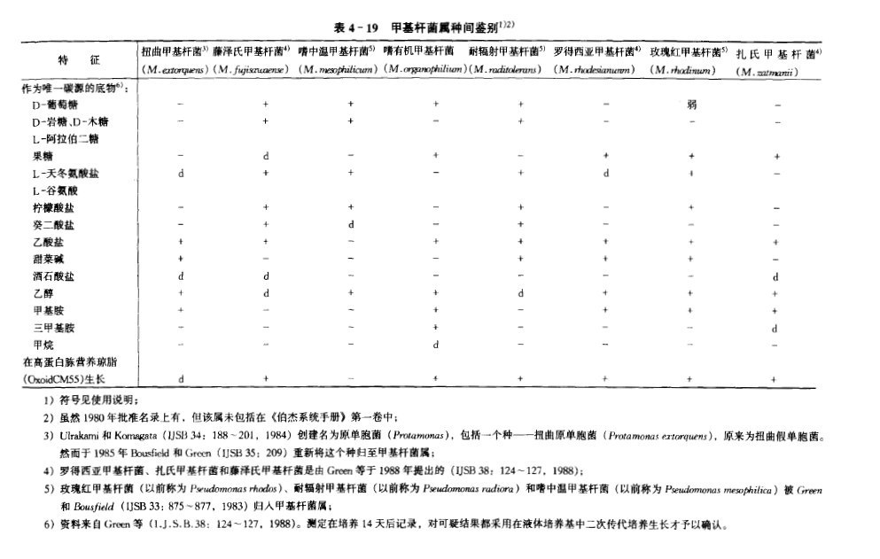 杆状,0.8-1.0μm X 1.0-8.0μm。单个或罕见成簇,也罕见分枝或多形态。以单极毛、亚极毛或侧生鞭毛运动,有的菌没有强烈的运动。细胞常含有大的嗜苏丹颗粒,有时有异染粒。细胞革兰氏阴性,有的菌株为革兰氏染色可变,代表菌株具有革兰氏阴性细胞多层细胞啼结构和柠檬酸盐合成特性。多数菌株生长缓慢,有的不能在营养琼脂上生长;在甘油-蛋白胨琼脂上的菌落直径1-3mm。浅粉到亮橙红色。在甲醇-无机盐琼脂上菌落为更均一的浅粉色。色素是非水溶性,可能是类胡萝卜素。在液体培养基中会形成粉色表面菌环或菌膜。严格好氧,氧化酶和接触酶(常弱)阳性。化能异养荫,兼性甲基营养菌和罕有兼性甲烧营养菌。有的菌株可利用甲烷作为惟一碳、能源,但如在无机培养基上不能维持甲烷环境,该特性很易丧失。有报道代表菌株能消化C1化合物和通型柠檬酸途径(icl-途径)。当在复杂的有机培养基上有完整的三羧酸循环。该属成员分离千土壤、尘土、淡水、湖泥、叶表、瘤、稻谷和医院环境。最适温度25~30t,包括8个种,它们的鉴别见表4-19。能以一个碳为惟碳源的革兰氏阴性好氧菌还有10个属,它们的鉴别见表4-20。