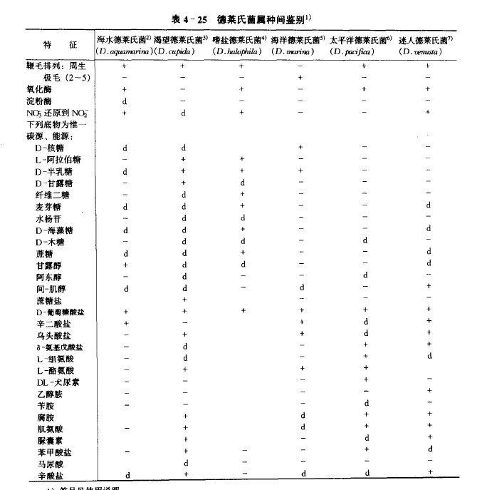 直杆状,0.8-l.1μm X 1.5-3.0μm。细胞积累聚-β-羟基丁酸盐颗粒(PHB)作为胞内贮存物。在老培养物或不利条件下通常有退化型出现。细胞不形成微胞囊和芽孢。大多数种有4-14根周生鞭毛运动,只一个种(海洋德莱氏菌D.marine)以2~5根极生鞭毛运动。严格好氧,以分子氧为未端电子受体。化能异养菌。能生长在以海水为基础含D-葡萄糖,NH4Cl的无机培养基上,Na+是所有的种所绝对必需的,最适生长的最低浓度范围是75-200mmol/L。所有种利用D-葡萄糖、乙酸盐、琥珀酸盐、DL-β-羟基丁酸盐、乳酸盐、甘油和L-丙氨酸盐。所有种能在35°C生长。所有种无脂酶、明胶酶和几丁质酶。所有种都不利用H2作能源和CO2为碳源。所有种无精氨酸双水解酶系统。发现于海洋环境,一个种(嗜盐德莱氏菌D.halphila)发现于高盐的土壤中。种间鉴别见表4-25。相近属的鉴别见表4-24。