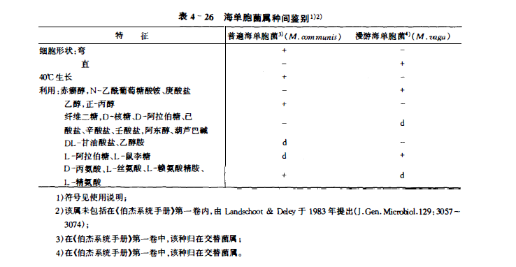 直或弯的杆菌,0.7-1.5μm X 1.8-3.0μm。不积累聚-β-轻基丁酸盐。不形成微胞囊或芽孢。革兰氏阴性。以一根极生鞭毛运动。化能异养菌,呼吸代谢而不是发酵代谢。分子氧是普遍的电子受体。不还原硝酸盐到亚硝酸盐,不反硝化。精氨酸双水解酶阴性。所有种都需要海水。利用D-山梨醇、DL-苹果酸、α-酮基葡萄糖酸盐、D-甘露糖、D-果糖、琥珀酸盐、富马酸盐、甘油和m-羟基苯甲酸盐。明胶酶和脂酶均为阴性。种间鉴别见表4-26。相近属的鉴别见表4-24。
