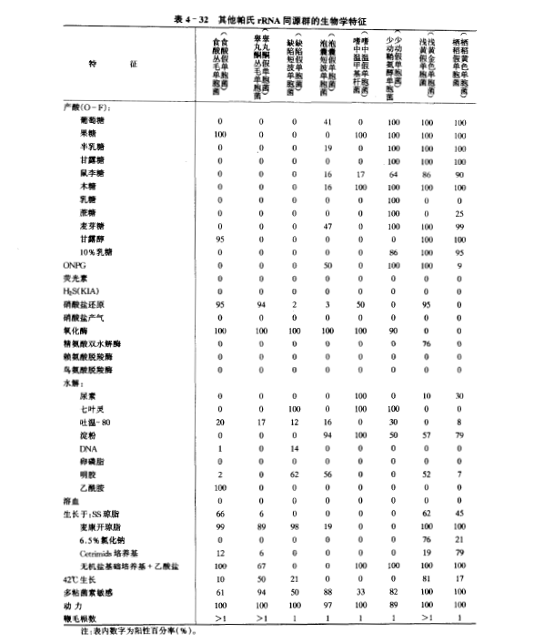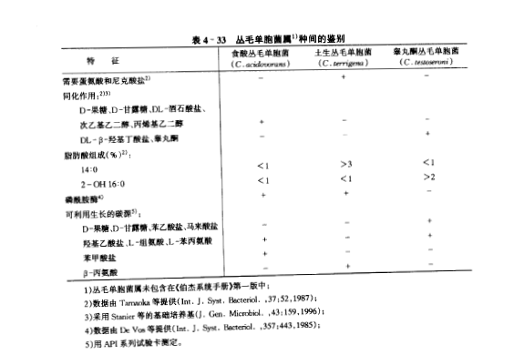 丛毛单胞菌属与近似属的区别见表4-32,丛毛单胞菌属种间的主要鉴别特征见表4-33。