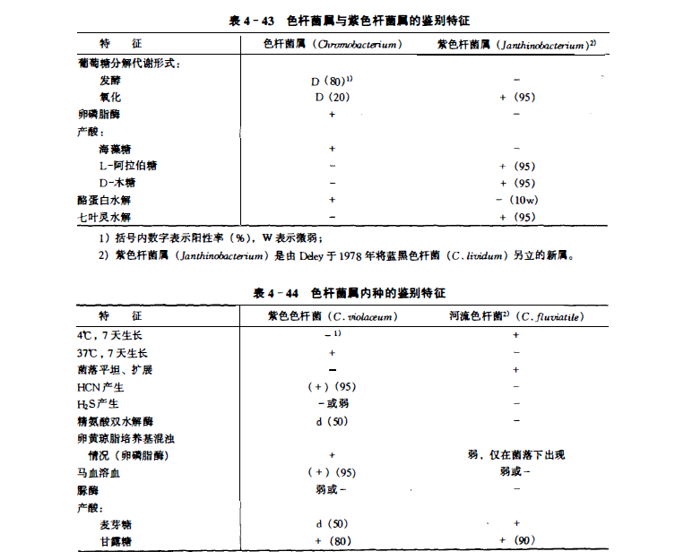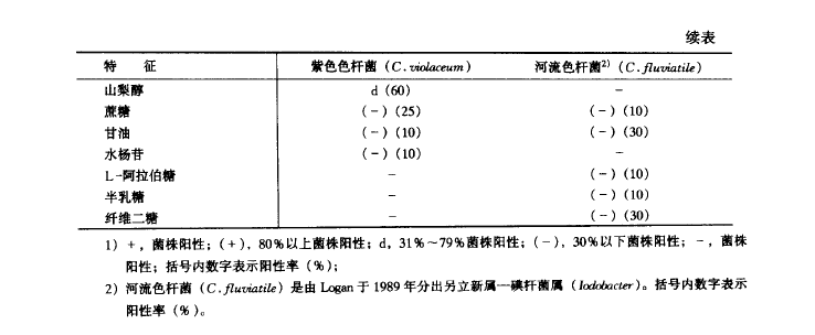 杆状,0.6-0.9μm X 1.5-3.5μm,两端钝圆,有时略呈细长弯曲。单个,偶尔成对,或伸展短链状。无荚膜。无静止期。革兰氏阴性,常含有条纹或两端着色的脂类内含物。通常以单极毛和1~4根亚极毛或侧毛运动。兼性厌氧。在固体培养基上产生奶酪状的紫色菌落;在肉汤中,其液体表面与容器壁的接合处形成紫色环;25°在普通培养基上生长,但最适、最高和最低温度因种而不同;最适pH7.8, pH4.5以下不生长。在6%NaCl以上的培养基中也不生长。化能有机营养,以发酵代谢为主。从葡萄糖、果糖、海藻糖和甘露糖产酸,不产气。不能从卫矛醇、肌醇、菊糖、乳糖、甘露醇和木糖产酸。通常氧化酶阳性(Kovacs's 试验)。接触酶阳性。吲哚隐性。V-P反应阴性。还原硝酸盐。能液化明胶。赖氨酸和鸟氨酸脱羧苯丙氨酸脱氨酸和七叶灵水解酶均阴性。紫色色杆菌从阿东醇、松三糖、蜜二糖和棉子糖不产酸。ONPG试验、DNA 酶产生、果胶酸盐分解试验均阴性。在KCN中生长。抗氨苄霉素 (lOOμg/mg) 和弧菌抑制剂0/129存在于土壤和水中。紫色色杆菌可偶尔引起哺乳动物包括人类的严重化脓感染或败血症。