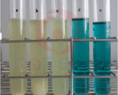 a:大肠埃希氏菌;b:鼠伤寒沙门氏菌;c:产气肠杆菌;d:金黄色葡萄球菌;e:空白对照