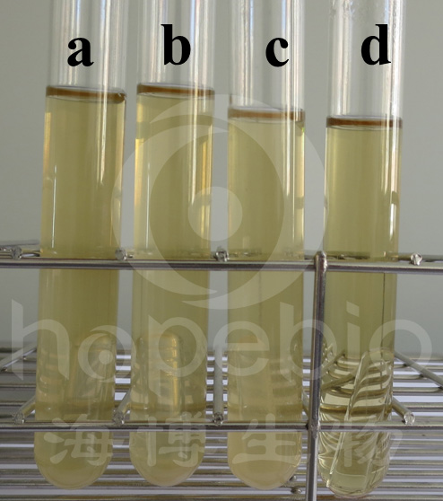 c为化脓链球菌(浑浊,小导管内无气体),d为空白对照。