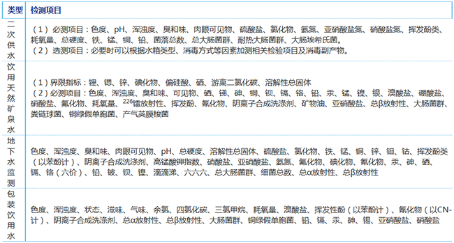 不同水质检测指标和限量要求不同,下边将主要对饮用水及饮用矿泉水的水质进行介绍: