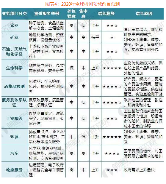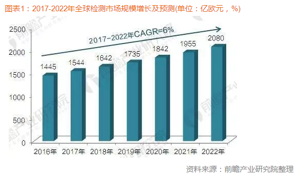 全球检测行业具有较强的抗风险能力,即便在2008年至2009年恶劣的国际经济危机冲击下,检测行业整个市场规模依然有所增长,在全球范围内没有出现破产案件,甚至裁员和重组的现象都很少发生。前瞻预测,在全球经济缓慢复苏的背景下,未来几年,全球检测行业规模增速将保持在5%以上。