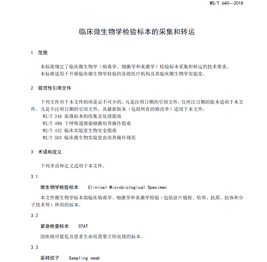 WS/T 640—2018 临床微生物学检验标本的采集和转运