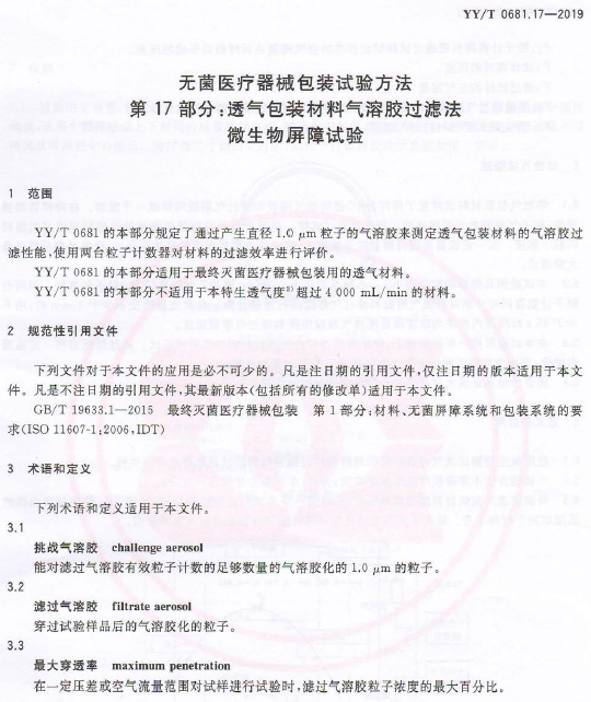 YY/T 0681.17-2019 透气包装材料气溶胶过滤法微生物
