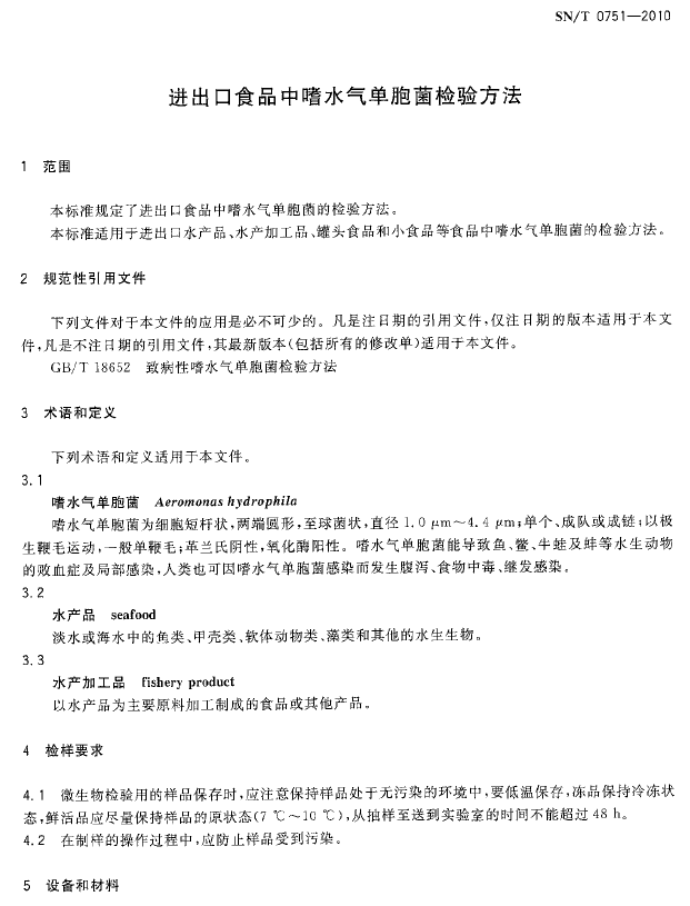 SN/T 0751-2010 进出口食品中嗜水气单胞菌检验方法