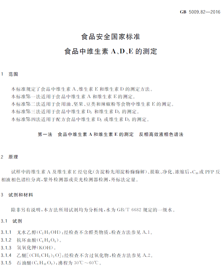GB 5009.82-2016 食品中维生素A、D、E的测定