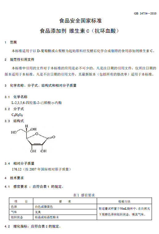 GB 14754-2010 食品安全国家标准食品添加剂 维生素C(抗坏血酸)