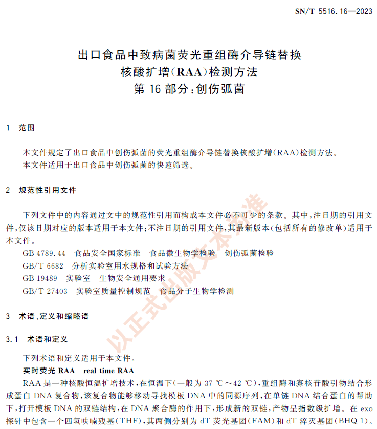 SN/T 5516.16-2023 出口食品中致病菌荧光重组酶介导链替换核酸扩增(RAA)检测方法第16部分:创伤弧菌