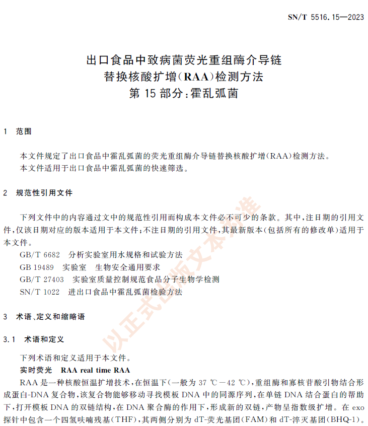 SN/T 5516.15-2023 出口食品中致病菌荧光重组酶介导链替换核酸扩增(RAA)检测方法第15部分:霍乱弧菌