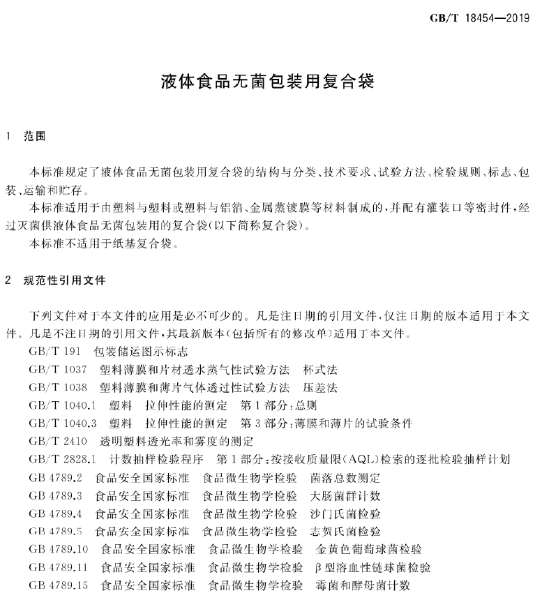 GB/T 18454-2019 液体食品无菌包装用复合袋