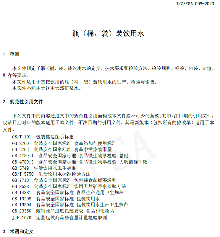 T/ZZFSA 009-2023 瓶(桶、袋)装饮用水