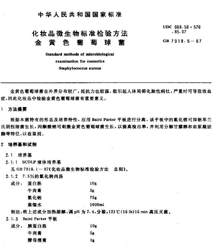 GB/T 7918.5-1987 化妆品微生物标准检验方法 金黄色葡萄球菌