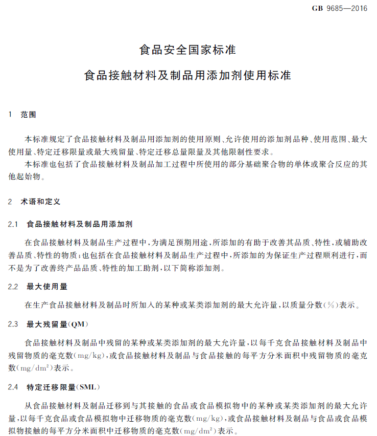 GB 9685-2016 食品安全国家标准 食品接触材料及制品用添加剂使用标准