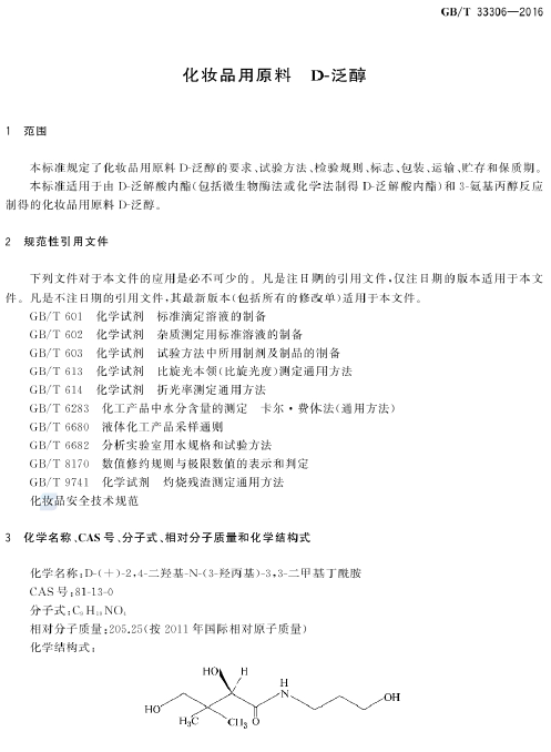 GB/T 33306-2016 化妆品用原料 D-泛醇