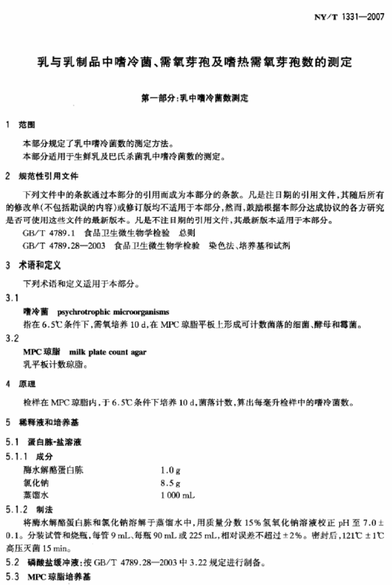 NY/T 1331-2007 乳与乳制品中嗜冷菌、需氧芽孢及嗜热需氧芽孢数的测定