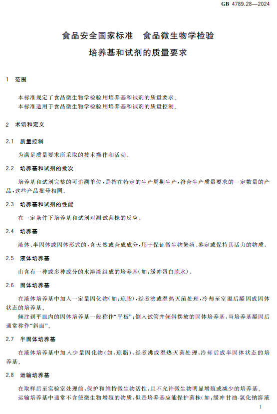 GB 4789.28-2024 食品安全国家标准 食品微生物学检验 培养基和试剂的质量要求