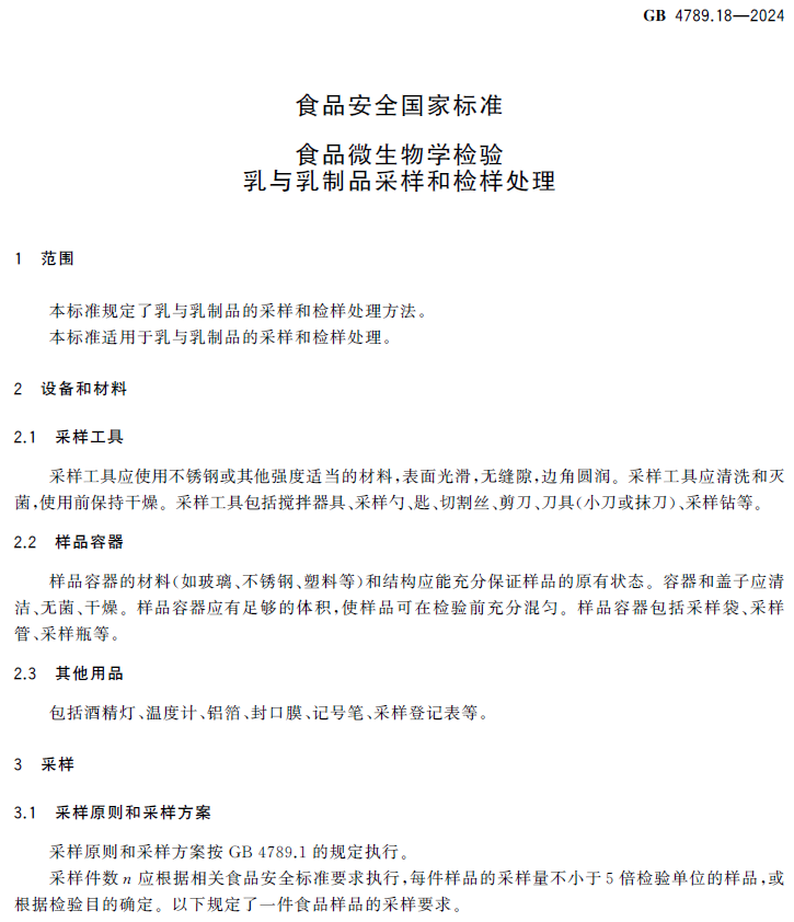 GB 4789.18-2024 食品安全国家标准 食品微生物学检验 乳与乳制品采样和检样处理