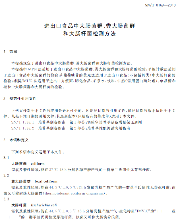 SN/T 0169-2010 进出口食品中大肠菌群、粪大肠菌群和大肠杆菌检测方法