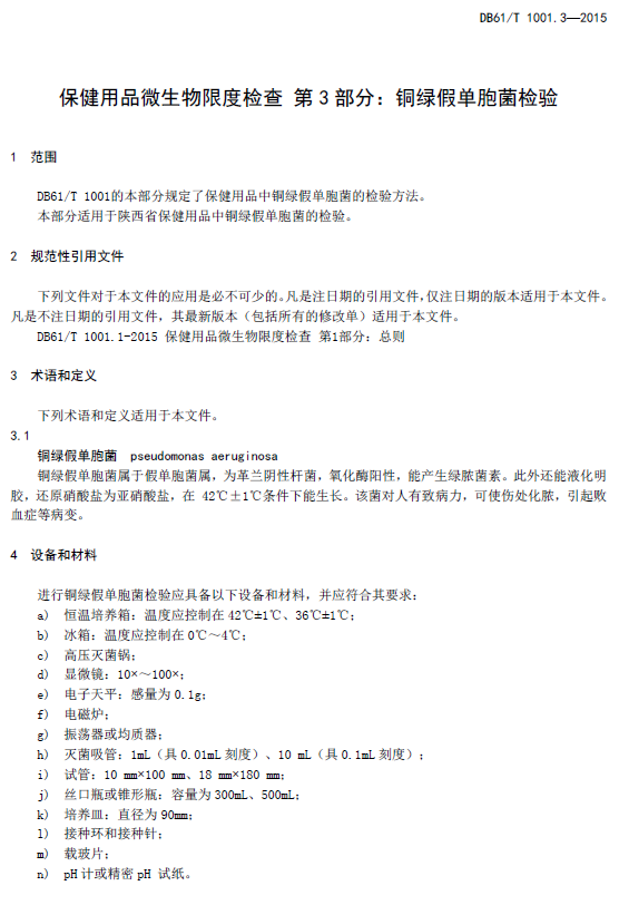 DB 61/T 1001.3-2015 保健用品微生物限度检查 第3部分:铜绿假单胞菌检验
