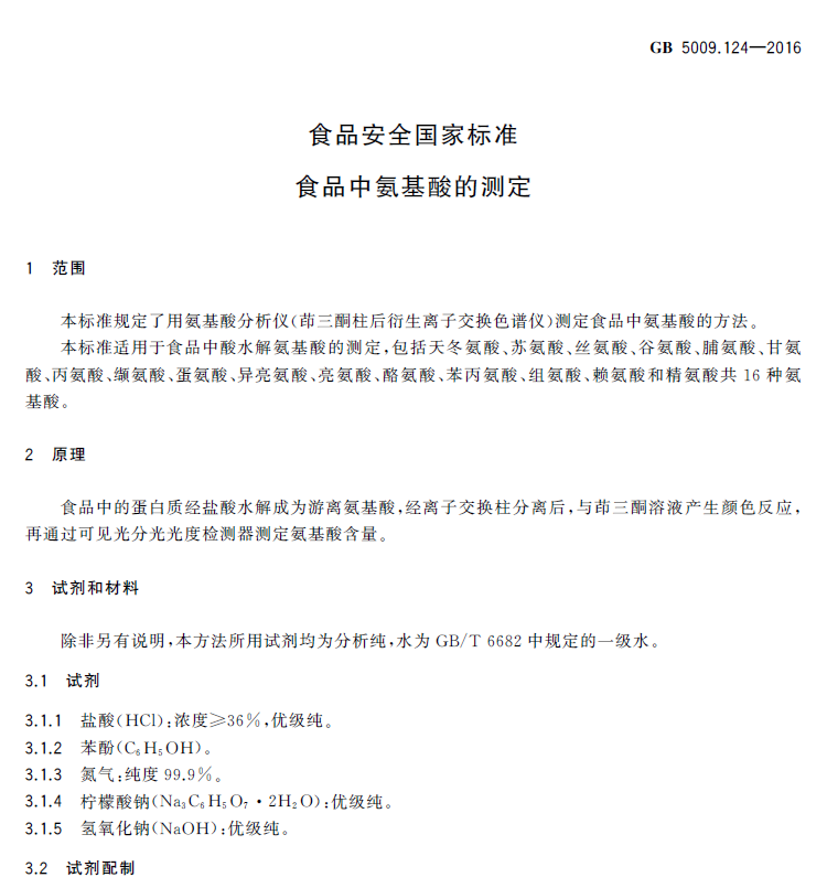 GB 5009.124-2016 食品安全国家标准 食品中氨基酸的测定