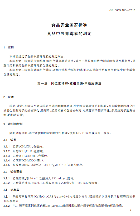 GB 5009.185-2016 食品安全国家标准 食品中展青霉素的测定