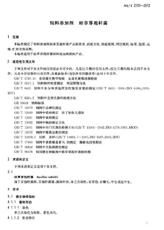 NY/T 2131-2012 饲料添加剂 枯草芽孢杆菌