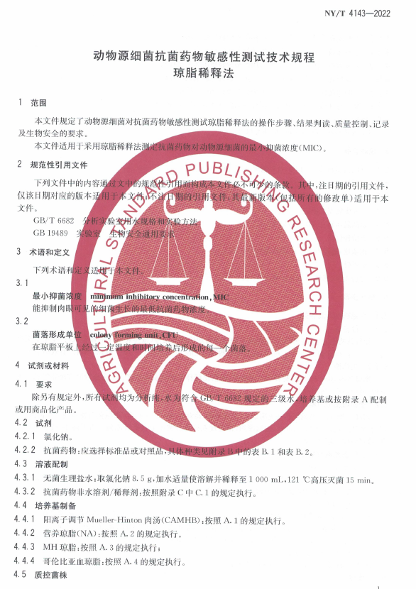 NY/T 4143-2022 动物源细菌抗菌药物敏感性测试技术规程 琼脂稀释法