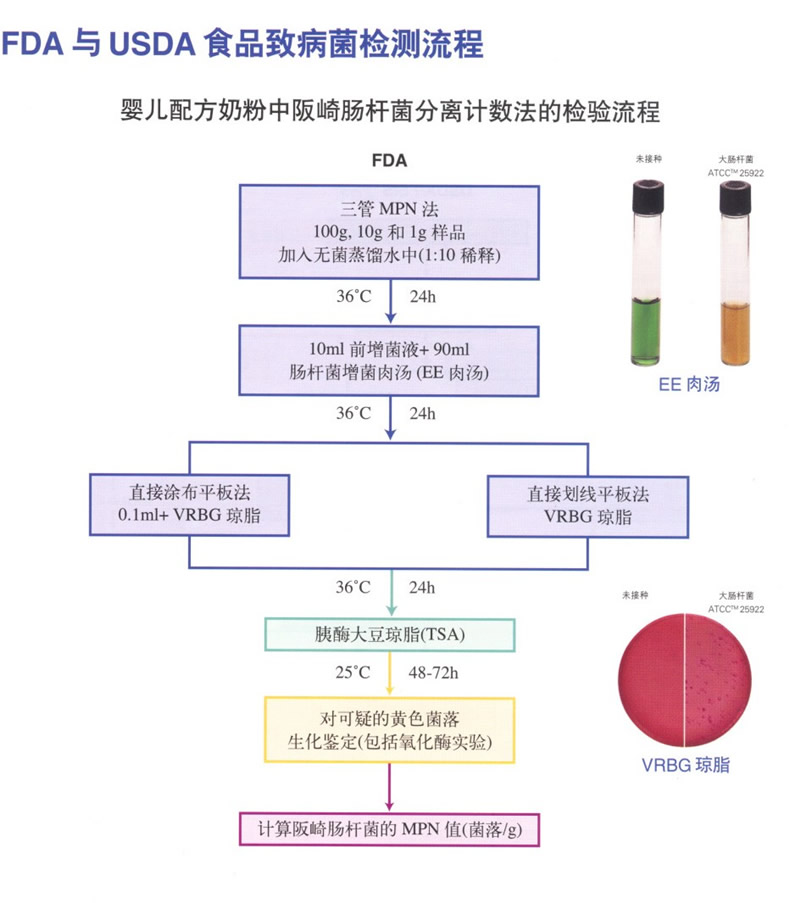 FDA与USDA食品致病菌检测流程中婴儿配方奶粉中阪崎肠杆菌分离计数法的检测流程,让大家对其检测过程有个更加深入的了解。