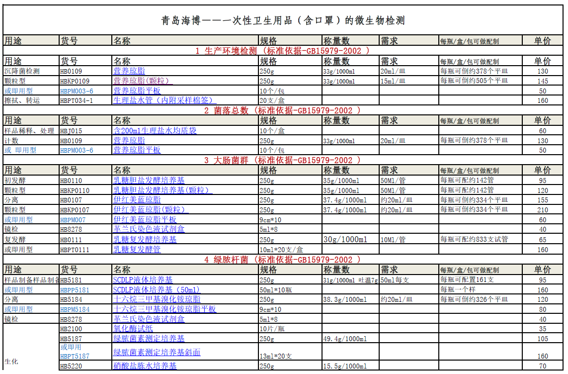 青岛海博--一次性卫生用品(含口罩)的微生物检测培养基核算表