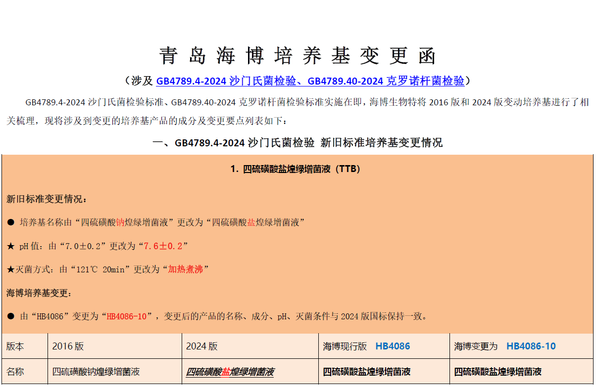青岛海博培养基变更函(涉及GB4789.4-2024沙门氏菌检验 GB4789.40克罗诺杆菌检验)