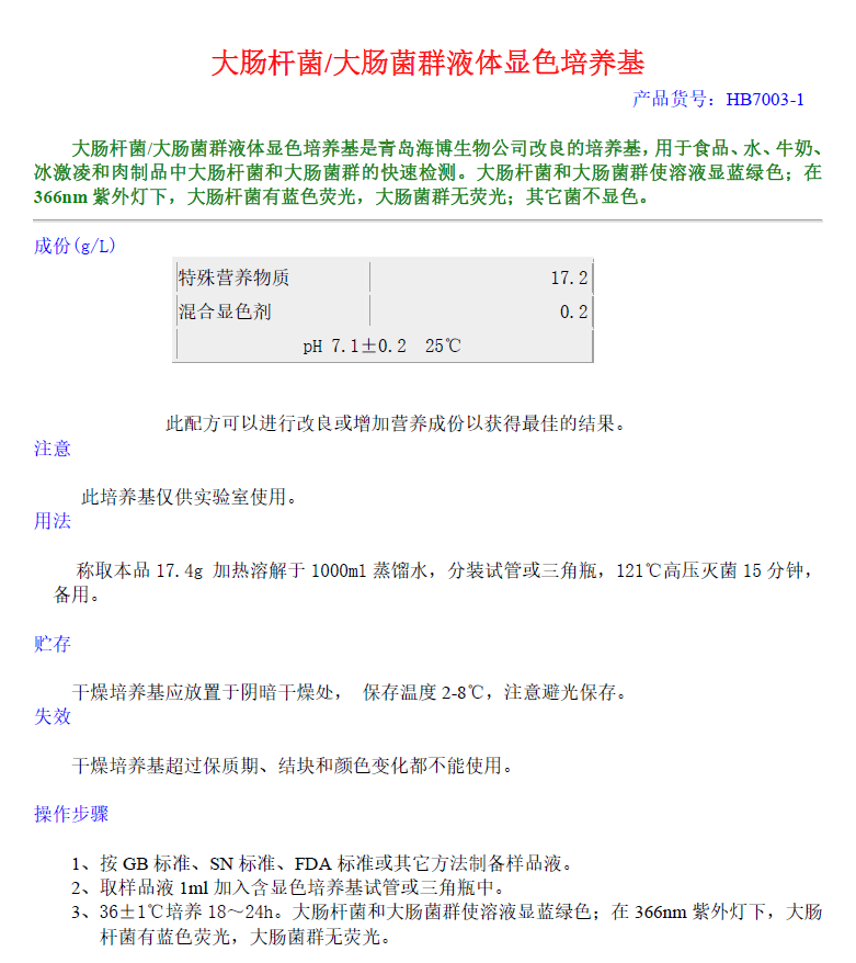 HB7003-1 大肠杆菌/大肠菌群液体显色培养基